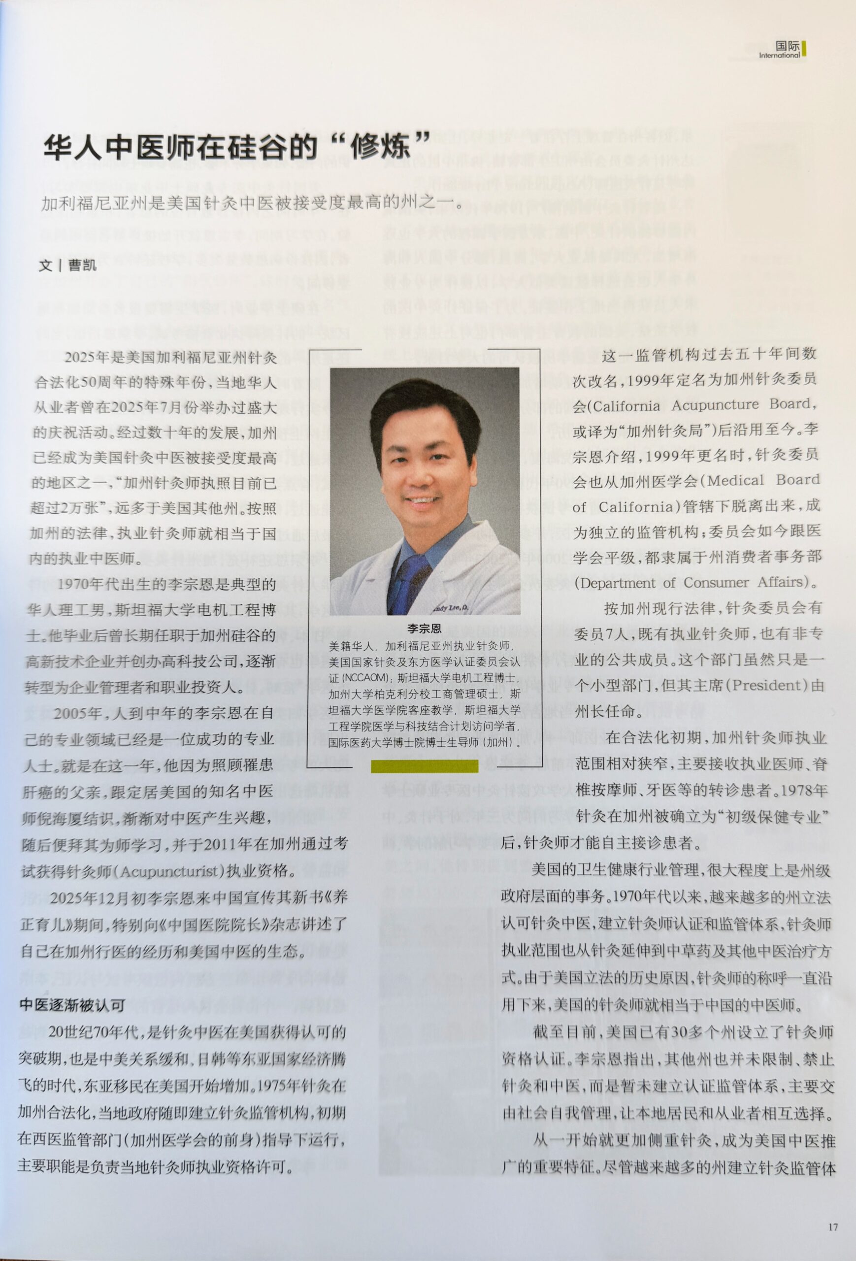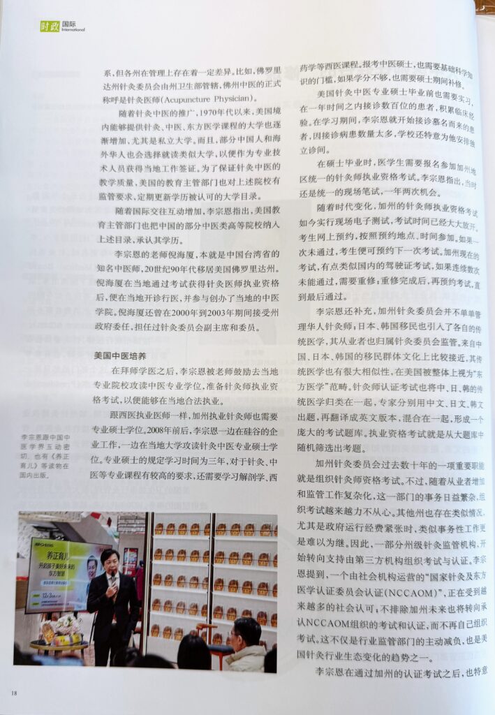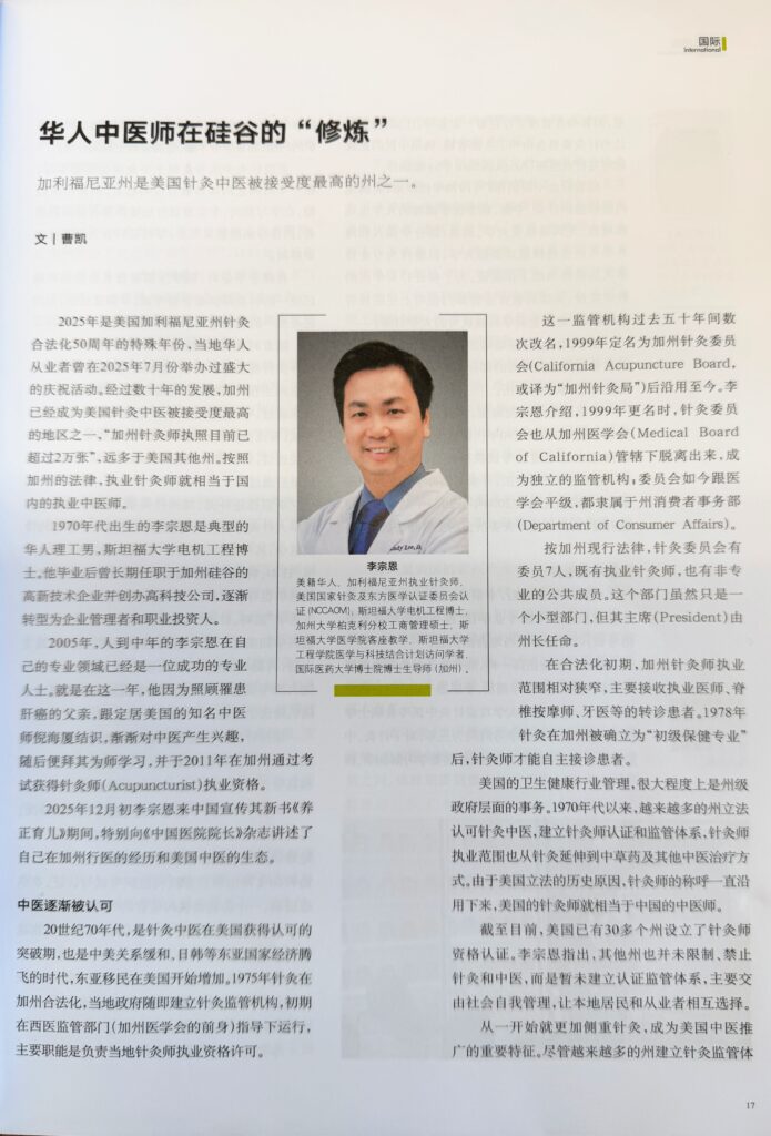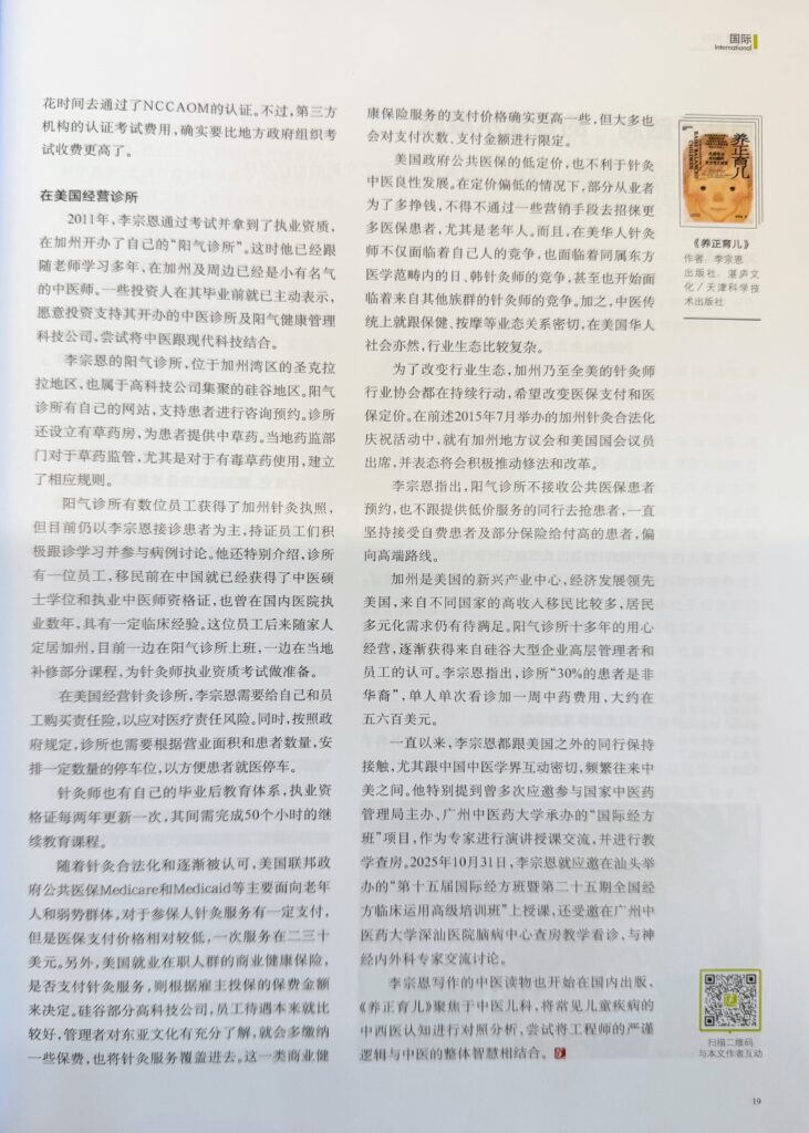 2025 年 12 月初李宗恩来中国宣传其新书《养正有儿》期间,特别向《中国医院院长》杂志讲述了自己在加州行医的经历和美国中医的生态。