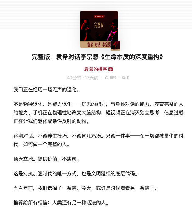 去年12月到北京時,與袁希先生有一場直播。袁希是一位知名的教育博主,經營教育類訪談多年,我們在直播上聊得很投緣,一聊就是兩個多小時,聊了很多人生哲理和教育觀點。袁希團隊把直播剪輯成近一個小時的視頻,剛把連結發給我,在此分享給有興趣的讀者。
